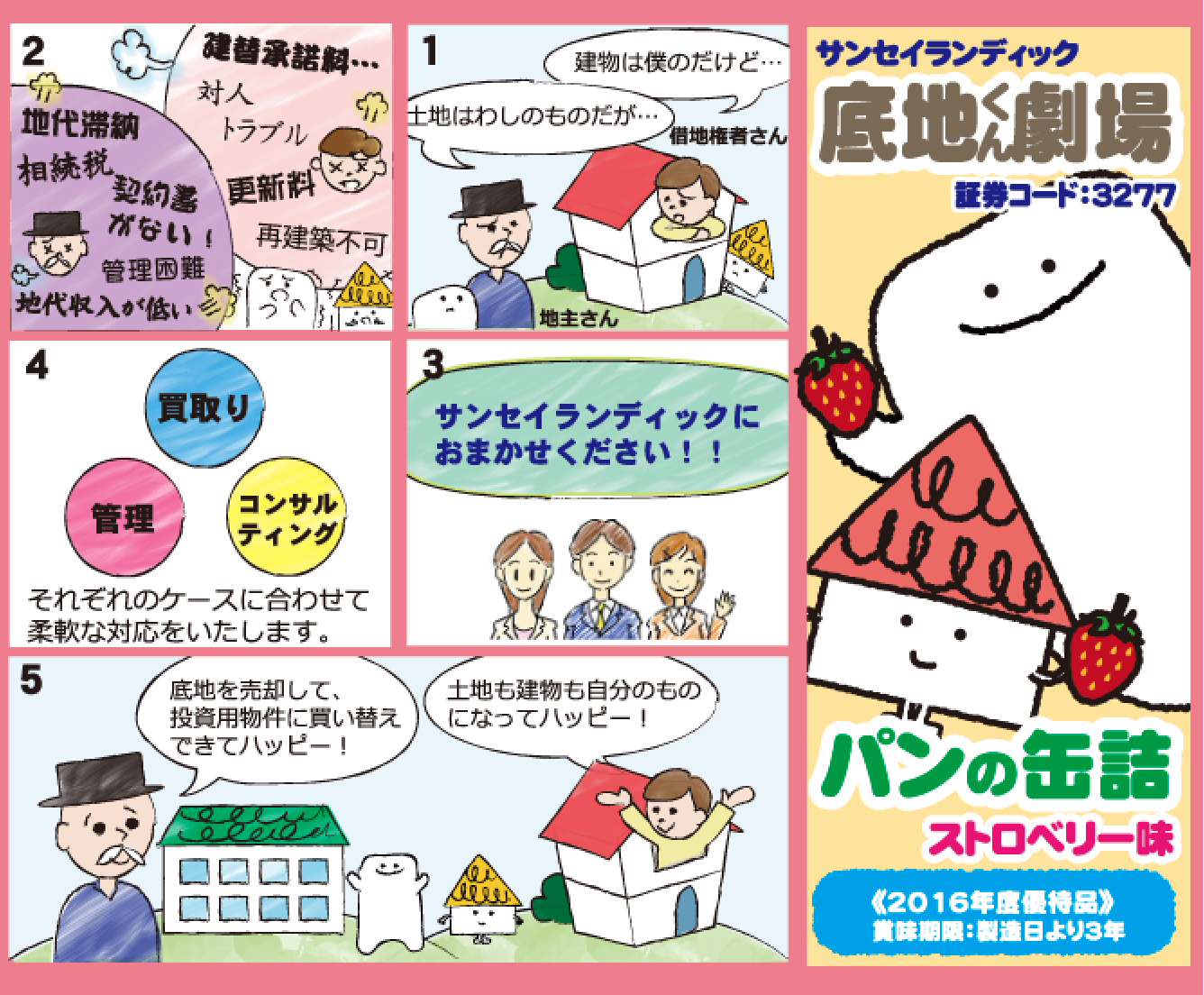 サンセイランディックは、この「底地」を買取り、分かれている権利をひとつにすることによって、不動産の本来の価値を取り戻す事業を行っているんだ。