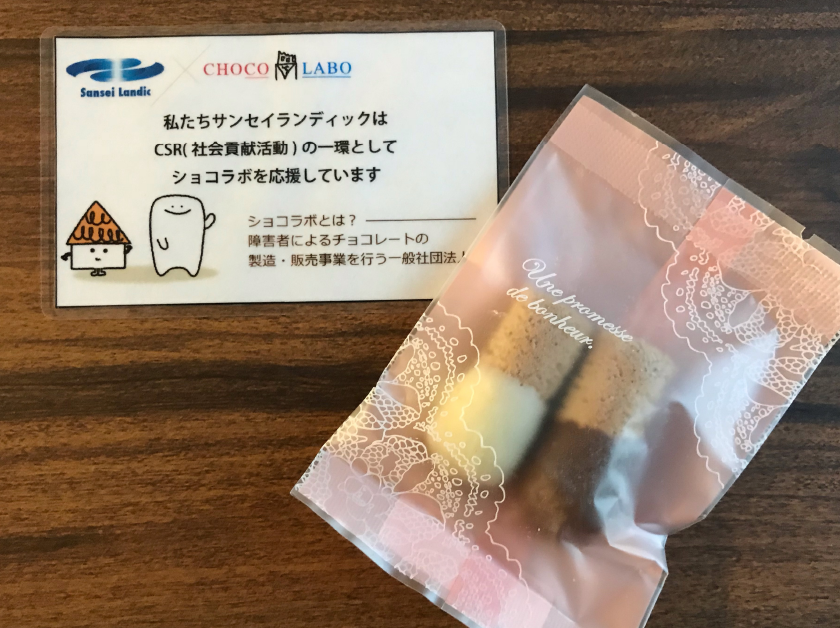 一般社団法人AOHが運営するチョコレート等のスイーツ菓子製造・販売を行っているショップです。障がい者の自立支援を目指すショコラボの企業趣旨に賛同して、平成30年度より、本社・支店において、来客用茶菓子の購入、お客様への土産やイベントの景品として活用して購買支援を行っています。同社では、プロの技術指導のもと、美味しいスイーツ作りで障がい者の雇用の場を創出し工賃アップを目指しております。